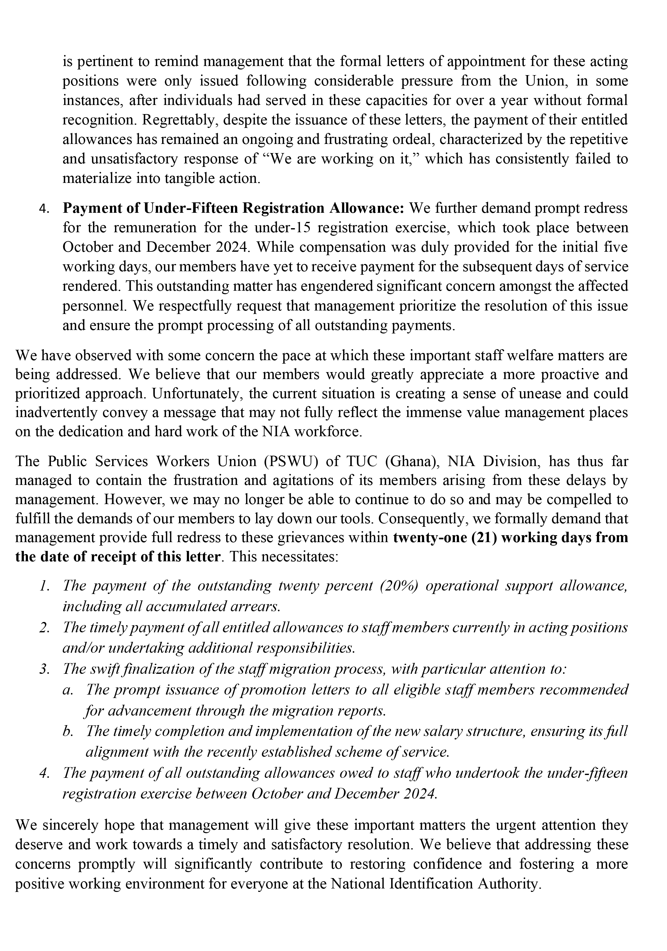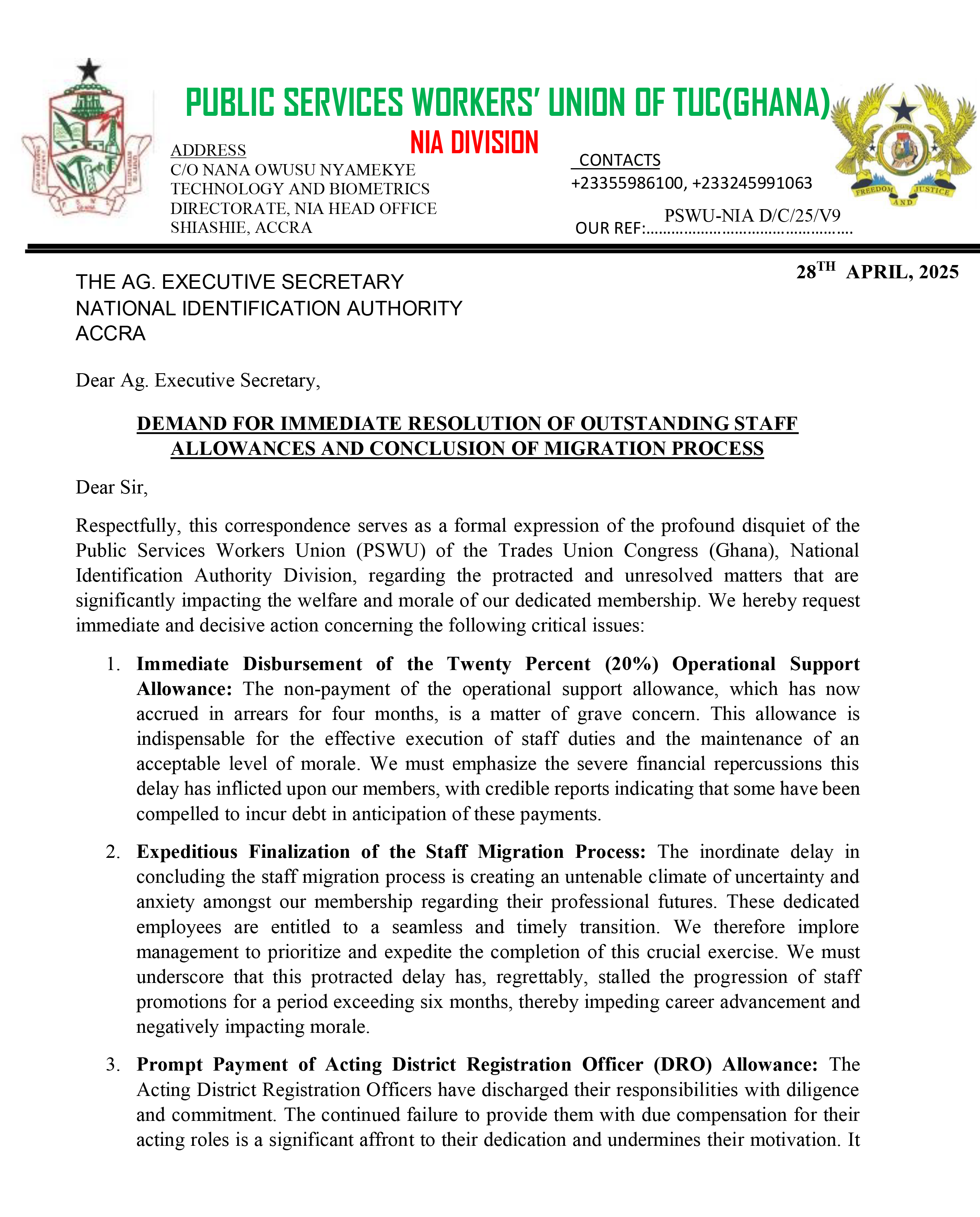 Gift-Tech Media has intercepted an unverified but strongly worded letter purportedly sent by the Public Services Workers Union (PSWU) of the Trades Union Congress (TUC), Ghana, specifically its National Identification Authority (NIA) Division, addressed to the Ag. Executive Secretary of the NIA. The letter, dated 28th April 2025, outlines a series of longstanding grievances, which the Union claims have negatively impacted staff morale, financial stability, and professional advancement within the Authority.