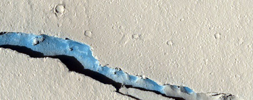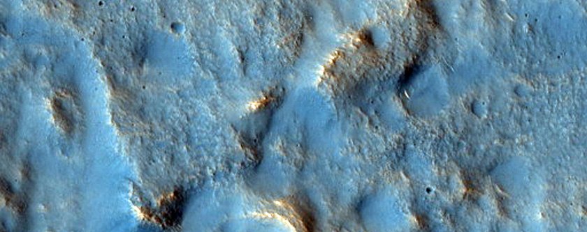 False colors assigned to sure minerals make Syria Planum an inky blue that is speckled with gold: