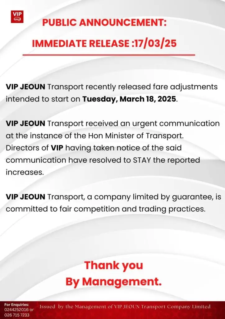 VIP Jeoun, one of Ghana’s leading intercity transport operators, has announced the suspension of its planned fare increases, following an urgent communication from the Minister of Transport.